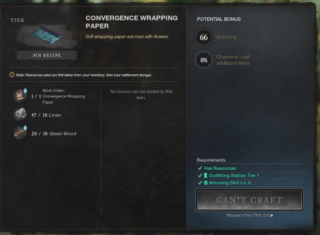 Had the same problem. Picked up quest in Brightwood, went to Monarch’s Bluff to do all my crafting. In Monarch’s Bluff, also got wrapping paper quest. Could not complete in Monarch’s Buff with Tier 4 workshop. Went to a Tier 2 in Brightwood and it worked fine. Was able to finish in both places.